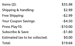 2. Change the quantity to 2 boxes to trigger a $10 discount, and checkout with Subscribe & Save to get an additional 5%-15% off.