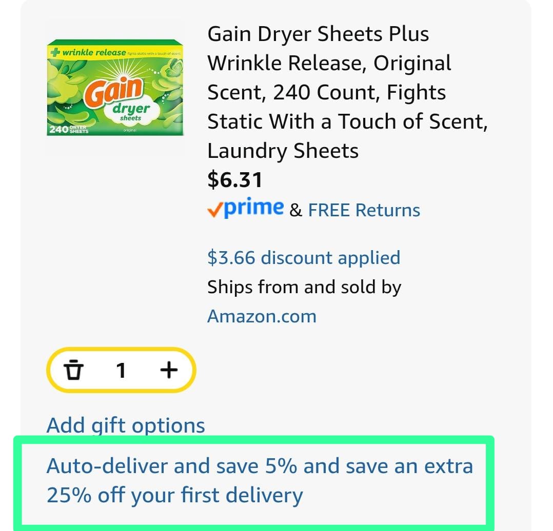 Now follow the same Subscribe & Save steps as mentioned above from step 2 and on — your total will come to just $24.77, and you’ll also get a $15 Amazon credit!