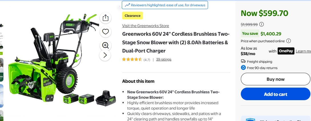 Greenworks 60V 24″ Cordless Brushless Two-Stage Snow Blower $599