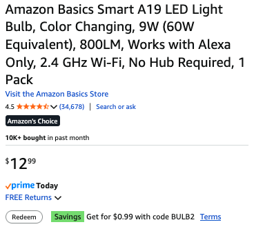 Amazon Basics Smart A19 LED Light Bulb $0.99