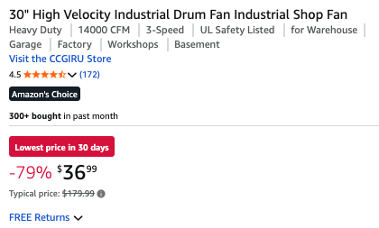 - High Velocity Air Flow : This industrial drum fan is made with a 1/3 HP powerful motor and 3-speed setting (Low 5000 CFM / Medium 7000 CFM / High 8500 CFM), which provides massive airflow for ventilating large areas, suitable for warehouse, workshop, factory, garage, basement and covered Patio