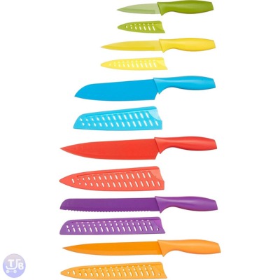 - 12-piece color-coded knife set includes 6 knives with matching knife covers; Knives include: paring knife, utility knife, Santoku knife, carving knife, chef’s knife, and bread knife