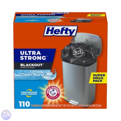 - 13 Gallon Black Garbage Bags: This package contains 110 Hefty Ultra Strong 13 Gallon Trash Bags in Blackout, Clean Burst scent