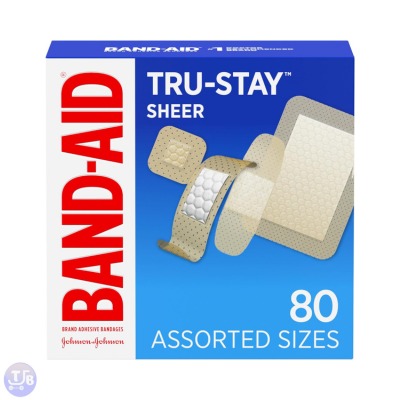 - 80-count box of Band-Aid Brand Tru-Stay Sheer Strips Adhesive Bandages to help minor cuts and scrapes heal.