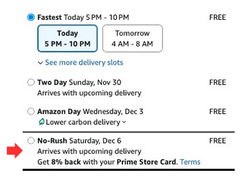 At checkout, look for the “No-Rush Shipping” option — you may earn up to 8% back with your Prime Card. No quantity limits. Actual offer may vary by account.