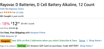 (2) Now go to 12-Pack Rayovac D Batteries and redeem the “$5 gift card with purchase” promo on page