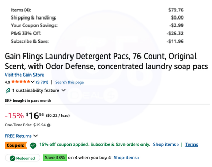 You will see 3 discounts at checkout this only $38.49-$46.46 for the 4 cases of 76 Pacs.