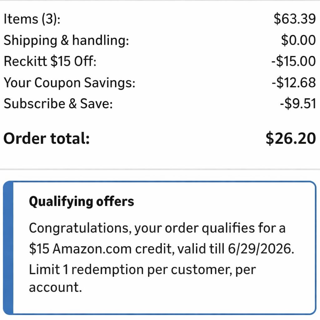 Your total will be only $26.20-$29.37 + you’ll receive a $15 Amazon credit!