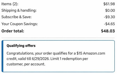 You’ll qualify for a $15 Amazon credit. In addition, you can submit a rebate here with Proctor & Gamble for a $15 rebate for spending $50+