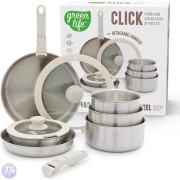 GreenLife 10-Pc Stainless Steel Pots and Pans Set $59.99 COOKWARE SET INLCUDES: 8” Frypan, 9.5” Frypan, 11” Frypan,1.58QT Saucepan, 2.32QT ….. Get This Deal